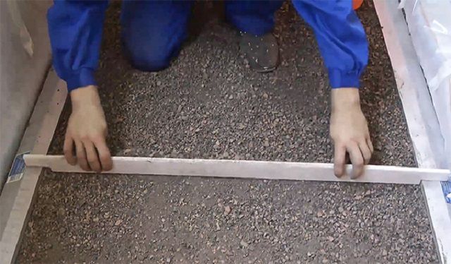 Установка материала начинается с изготовления деревянной обрешетки. Это можно сделать по тому же принципу, что и отделка пеноплексом по лагам. Затем нужно насыпать керамзит так, чтобы он не выступал над обрешеткой. Выровнять материал можно алюминиевым столбиком. После утепления керамзитом нужно положить сверху фанеру или OSB-плиту.
