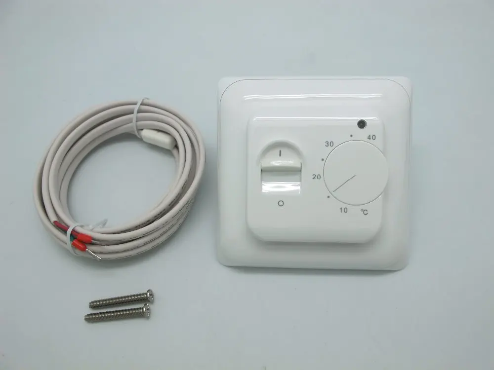 Термостат выпускается в белом корпусе или цвета слоновой кости. И монтируется в стандартную стенную коробку для розетки. Выносной датчик температуры установлен непосредственно вблизи греющих элементов теплого пола.