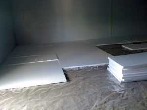 - На уложенную и зафиксированную пленку плотно укладываются друг к другу и стенам листы пенопласта.