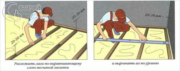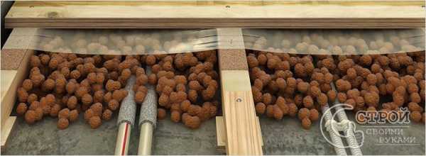 Принцип утепления керамзитомМатериал засыпают между лагами, затем хорошо разравнивают, используя лаги как маяки. Рекомендуется применять не чистый керамзит, а материал, который смешан с определенным количеством гравия.