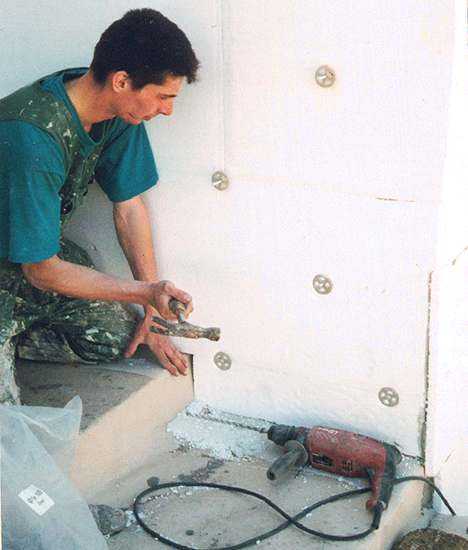 На фото – утепление стен пенопластом при помощи зонтичных дюбелей.
