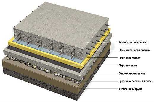 - Пол требует еще большего внимания, так как для него требуется устройство подушки из песка и щебня, слой теплоизоляционного материала, а также стяжка, толщина которой должна составлять как минимум 5 см, но лучше сделать ее чуть толще для надежности.