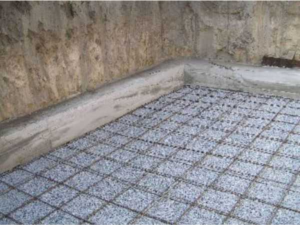- На следующем этапе либо укладывается еще один слой гидроизоляции, либо сразу кладется сетка для армирования с толщиной проволоки не менее 3-х мм.