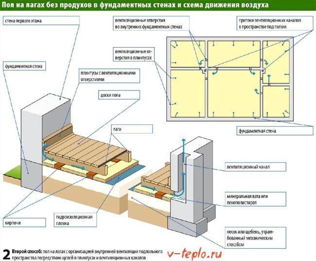 Примечание к схеме утепления. На схеме деревянного пола показано, что половая доска укладывается непосредственно на гидроизоляцию, но это неправильно. Дерево намокает и снизу может образоваться плесень, поэтому, прежде чем класть половицы, на лаги нашивают обрешётку из необрезной доски 50 мм толщиной и шагом 50 см, чтобы под полом была естественная вентиляция.
