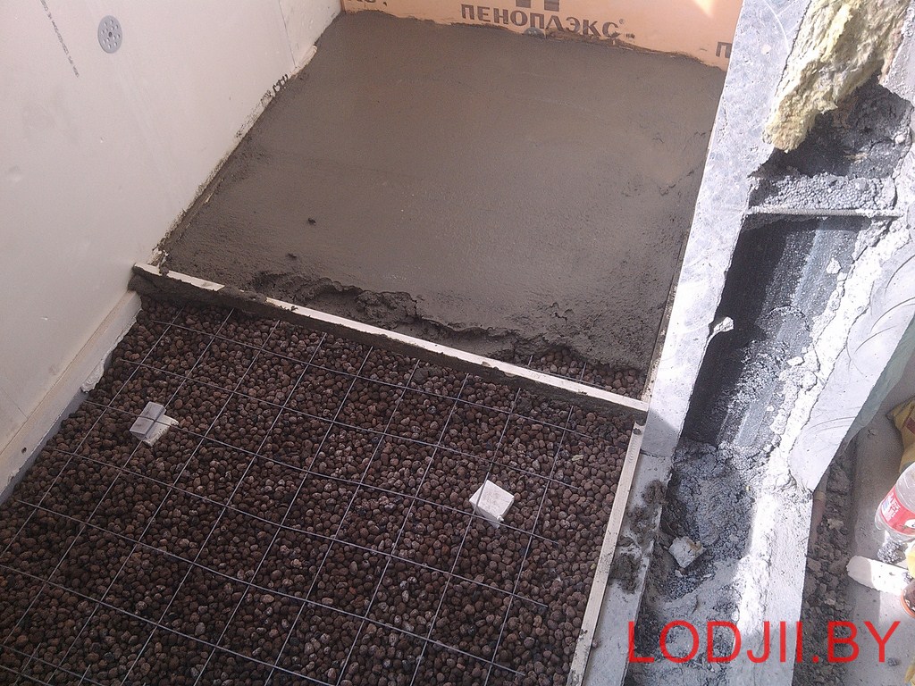 Рис.4. Для утепления пола лоджии применяют несвязанную стяжку. Эта стяжка укладывается на слой утеплителя. В качестве утеплителя применяют пенополистирол. Это прочный и эффективный теплоизоляционный материал. Стяжка имеет толщину 3 – 4 см. Для повышения прочности ее армируют металлической сеткой с размером ячейки 10х10 см.