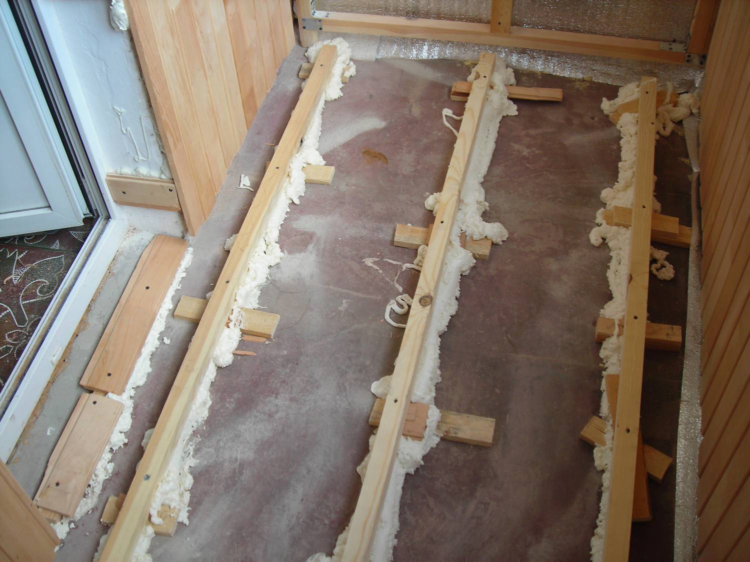 В старых домах часто на лоджии уже имеются деревянные полы. Это традиционные полы на лагах. Для утепления такого пола необходимо снять напольное покрытие (обычно это доски), под ним будет находится деревянные лаги. Между лагами прокладывается утеплитель. Поверх утеплителя и лаг укладывается пароизолятор. После чего можно настелить ранее снятое напольное покрытие.