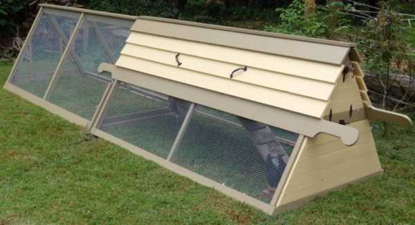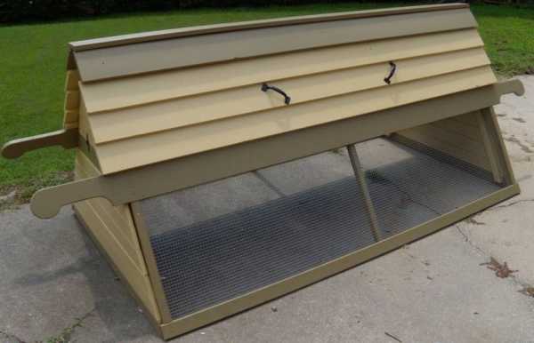 Подойдет также для нескольких куриц, кроликов, уток, индюшек. Один из минусов это маленькое пространство, но зато легко уместиться даже в небольшом сарае зимой и на хранении не будет занимать много места, после того как цыплята подросли. Есть выгул, гостиная со спальней. Конечно, если этот цыплятник будет стоять ранней весной или поздней осенью, то стоит задуматься об утеплении. Зато конструкция очень легкая, и хозяину (даже хозяйке) не составит труда перенести его на новый зеленый участок травы, после того как цыплята через два дня всю зелень сравняют с землей.