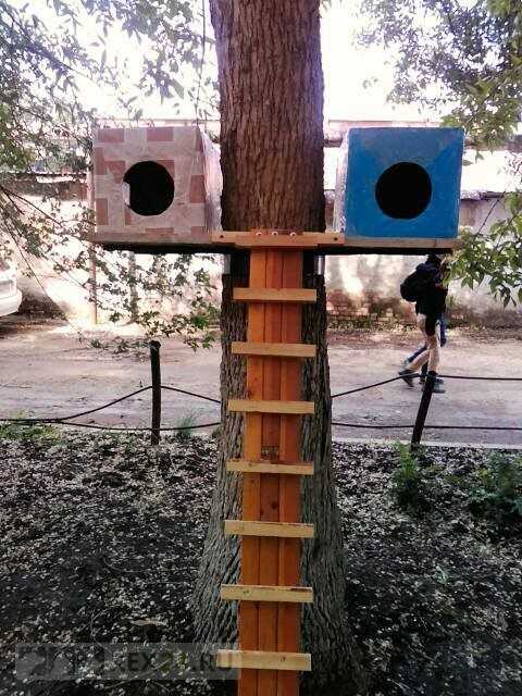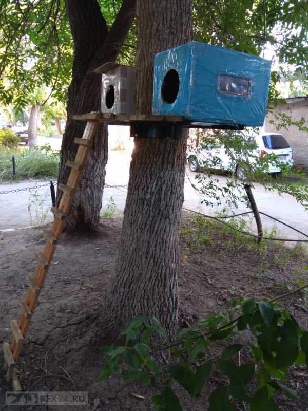 – На этот раз эти домики были закреплены на стволе дерева, растущего напротив окон моих родителей. Папа решил, что кошкам безопаснее кушать наверху, а не спускаться вниз к мискам, поэтому он построил площадку и закрепил на ней два домика, – рассказывает Наталья.