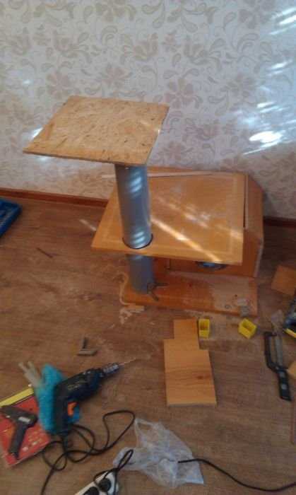 - Каркас домика или игрового комплекса в основном производится из ДСП, фанеры или МДФ. Для оформления своими руками подойдут любые породы дерева. Ключевым условием является отсутствие резкого запаха, иначе кошка будет избегать близкого нахождения со своим домиком.