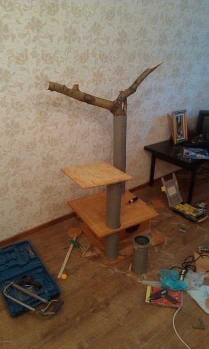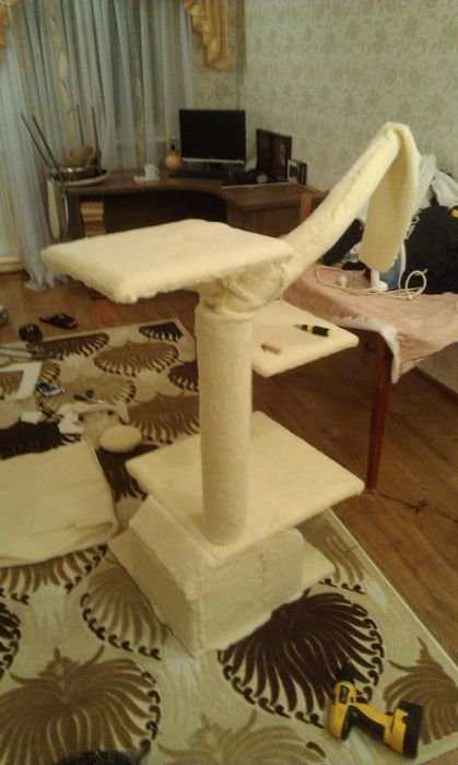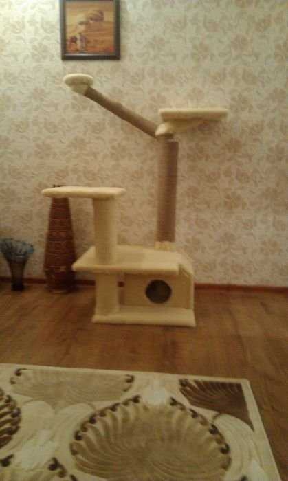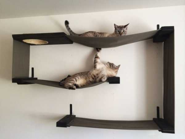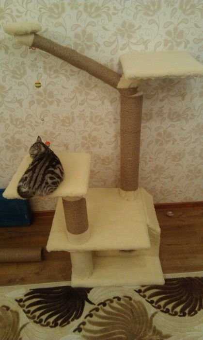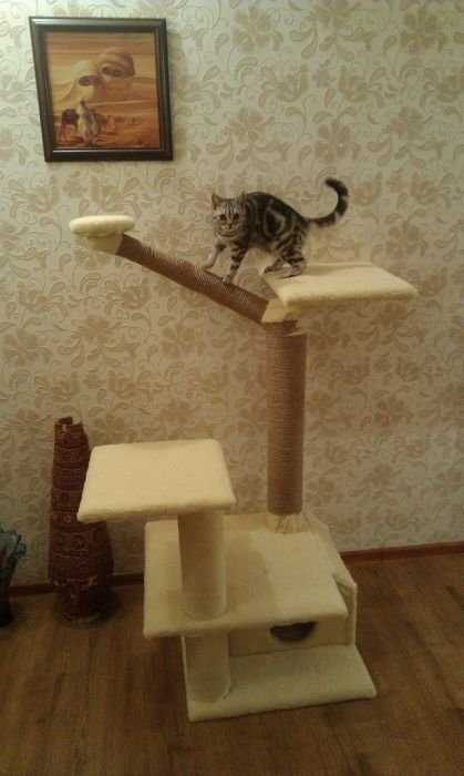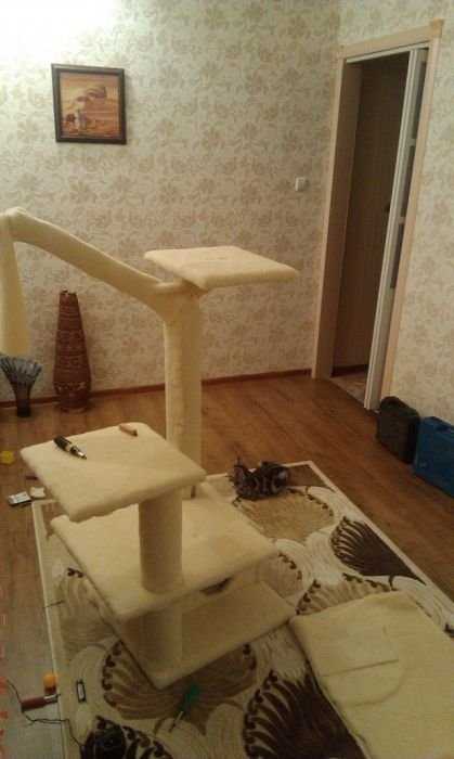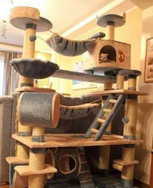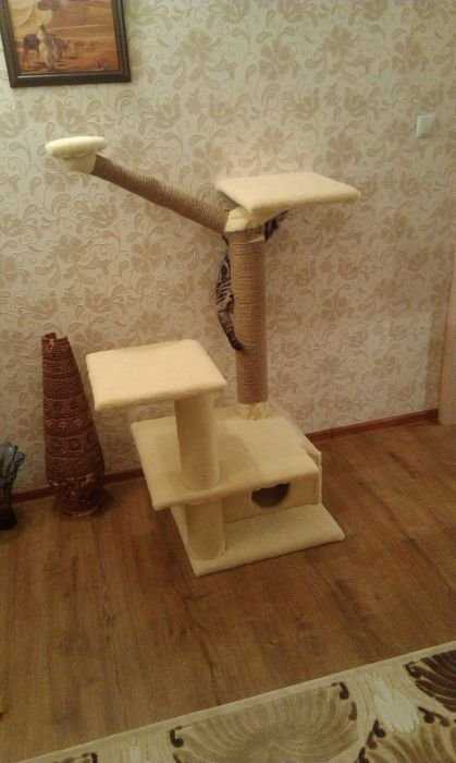 При наличии двух и более кошек предпочтительней оформить многоуровневый комплекс, где хватит места всем домашним любимцам. Следующее фото демонстрирует удачный вариант конструкции, где может разместиться ни одно поколение: