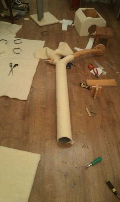 - Для каркаса когтеточки подойдут металлические или ПВХ трубы, обматывают их джутовой веревкой. С конструкцией необходимого приспособления для кошки можно ознакомиться на следующем фото: