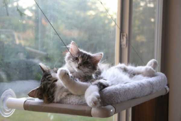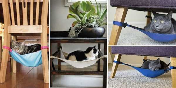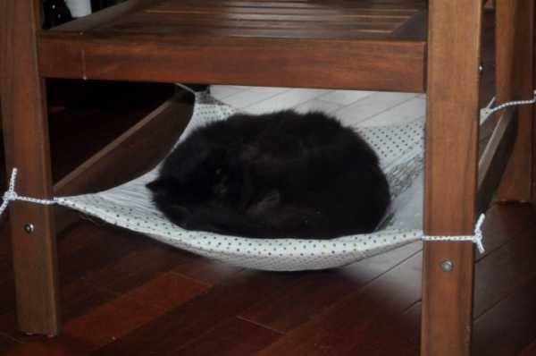 Удобно расположиться кошке можно и в гамаке. Крепления на них выполнены в виде липучек, петель или карабинов. Место фиксации выбирается произвольно, наиболее популярные варианты – между ножками стульев. Просторные собственные апартаменты позволяют зафиксировать гамак под потолком, как показано на следующем фото:
