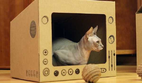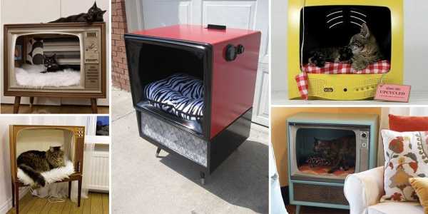 На самом деле кошкин дом может получиться из любого предмета с достаточно большим внутренним пространством. Даже из старого телевизора. Для кота — уютный домик, а для интерьера — интересный и фактурный объект.