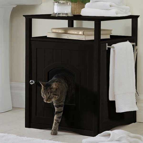 А если ставить отдельный домик для кота совсем некуда? Можно совместить его, например с тумбочкой. Ее можно сделать на заказ или переделать из уже существующей. Еще вариант — выделить ячейку в стеллаже и вставить в него коробку с отверстием-входом. Ее можно обшить искусственным мехом или тканью. Котики обожают уютное, замкнутое пространство, поэтому любимец наверняка будет рад новому дому. Очень красиво, оригинально и функционально.