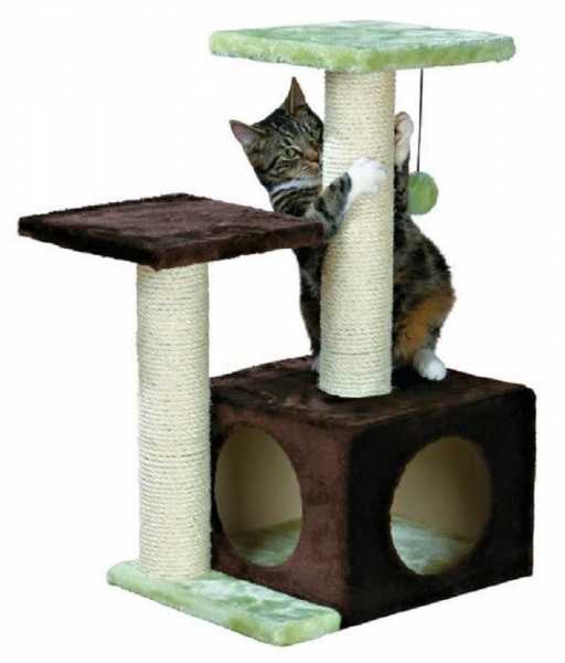 - Размер конструкции и уровень ее установки. Кошка обитает в нескольких плоскостях, для самца важно контролировать территорию, поэтому он будет стремиться расположиться повыше. Лежанка на подставке, высоко подвешенный гамак – оптимальный вариант для охотника. Естественно, игровой комплекс больших размеров не оставит равнодушным ни одного питомца. Для самок в приоритете – безопасность, особенно когда есть потомство. С этой целью уместно установить напольную конструкцию домика, а два выхода облегчит ее контроль над ситуацией.
