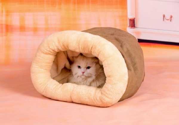 При желании стать обладателем неординарного домика, в качестве материала для обивки производители предлагают выбрать замшу, велюр, или искусственную кожу. Хотя для домашнего питомца более важна правильная конструкция домика и его удобное месторасположение, нежели стоимость изделия. Следующее фото наглядно демонстрирует грамотную установку недорогой лежанки для кошки: