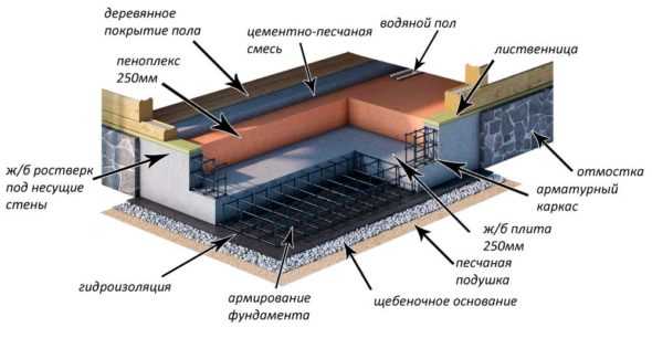- стяжку с армирующим слоем толщиной от восьми сантиметров, залитую по пятнадцатисантиметровым пенополистирольным плитам;