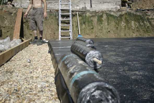 Затем на гравийную подушку уложили стеклогидроизол. Это необходимо, чтобы отделить щебень от бетона «пятки».