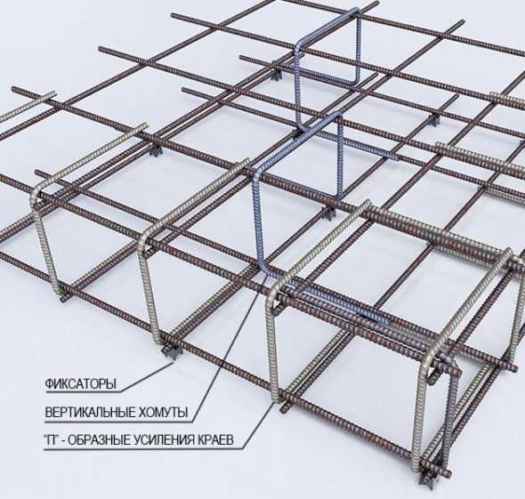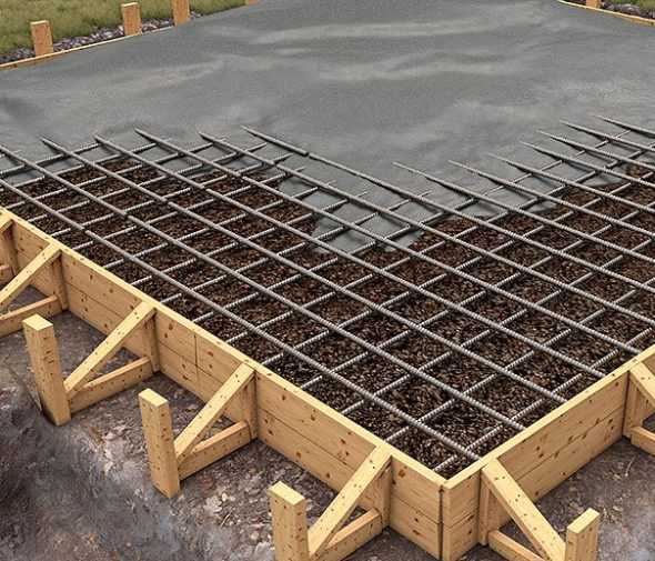 Выполняется вязка каркасной основы из арматуры, которая закладывается в опалубку и заливается бетонным раствором.
