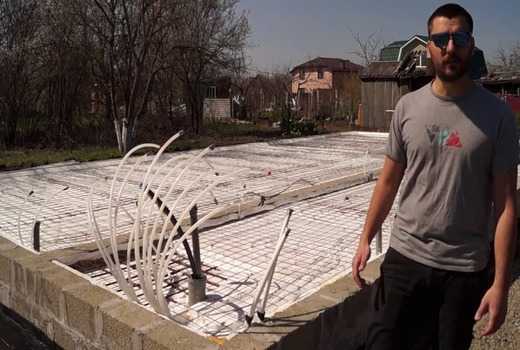 До начала бетонирования в конструкцию закладывают трубы из полиэтилена, чтобы устроить систему «теплый пол».