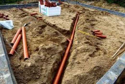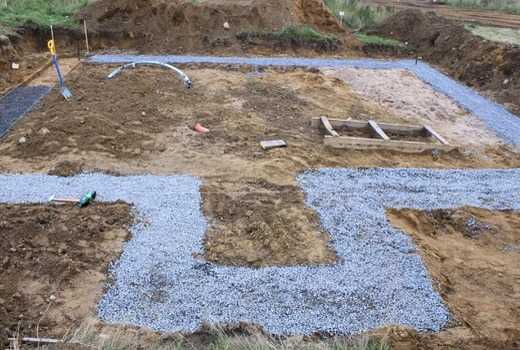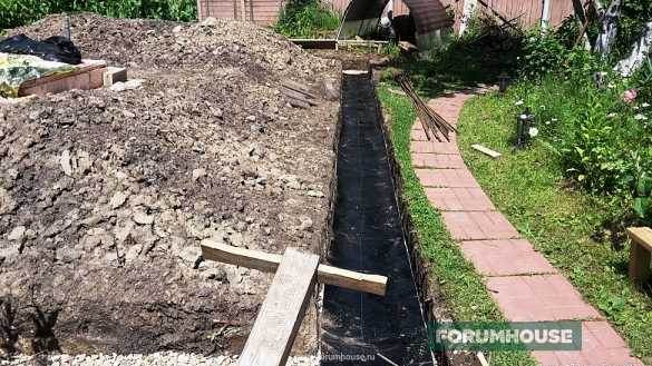 Полностью снимается дерновый слой почвы. По несущим стенам копается траншея, глубина которой соответствует проекту. Предусматривается запас под устройство насыпного дренажа.