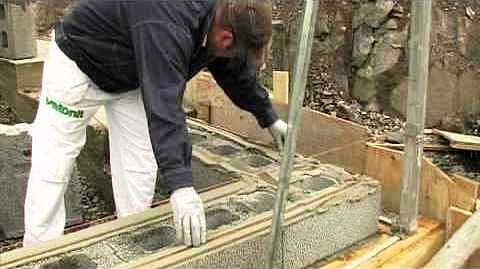 Блоки являются бортиками для заливки бетонного основания, а также выступают в роли съёмной опалубки. После заливки «пятки» и застывания бетона блоки убирают и используют для кладки ленты.