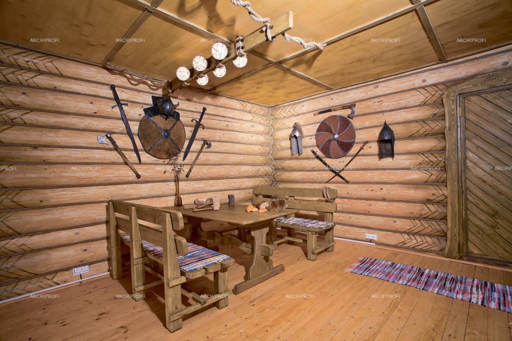 - Проектирование предбанника под интерьер русской избы, использование соответствующей атрибутики и резных элементов отделки потолка.