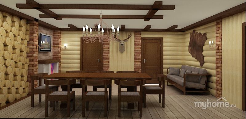 - Воплощение стиля шале, нарочито грубоватая мебель с созданием атмосферы охотничьего дома.