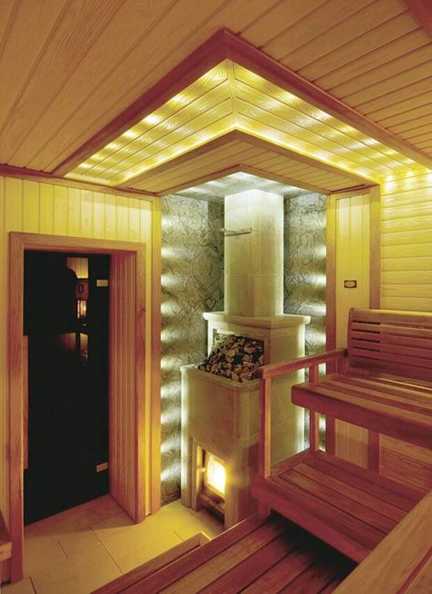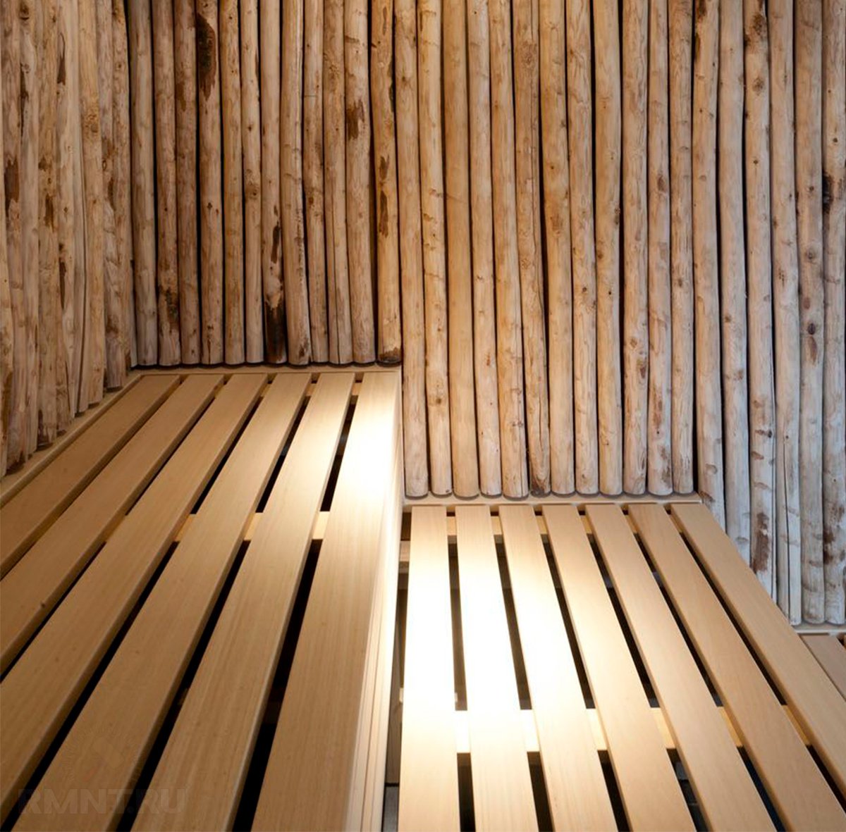 В маленьких банях устанавливают небольшие светильники. Это могут быть споты, точечная подсветка. Лучшими вариантами станут светильники пристенного типа (модели без подвесов). Располагать их нужно таким образом, чтобы комната была освещена одинаково по всему периметру.
