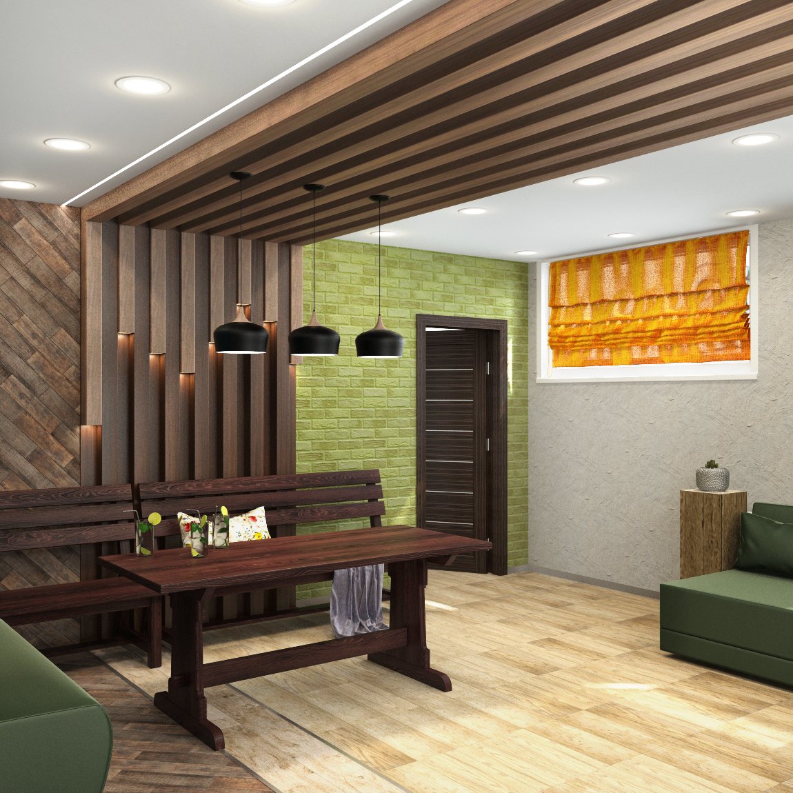 - Оригинальный проект интерьера предбанного помещения, создание гостевого пространства с акцентированием стены за диваном.