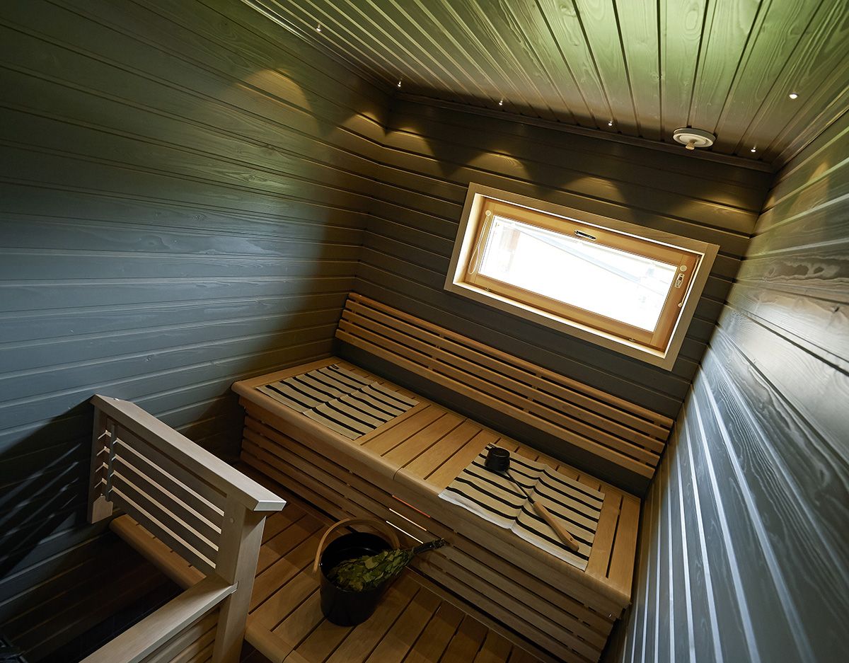 - Предбанник с большим окном, выполненный в духе современных традиций. Контраст цвета и фактуры используемой обшивки.