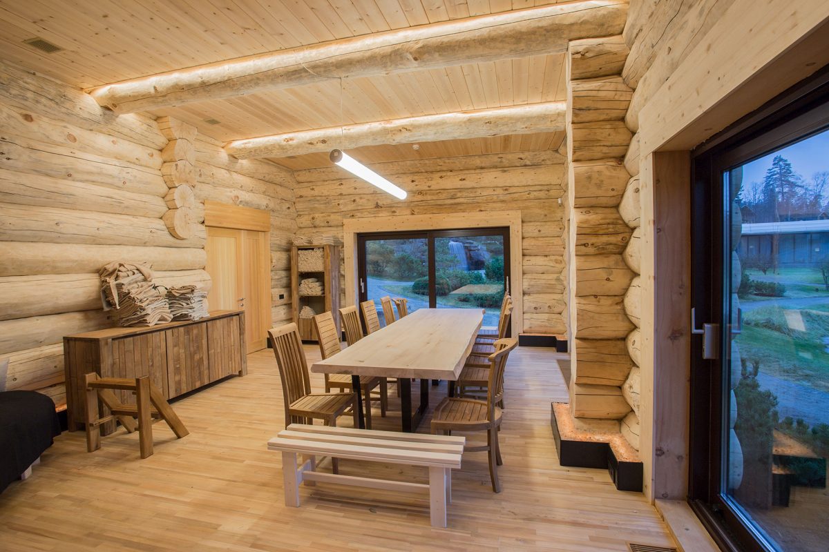 Кстати придутся такие аксессуары, как посуда с росписью под хохлому и самовар. В бревенчатой деревенской бане украсить предбанник могут стулья и столы в виде пеньков.