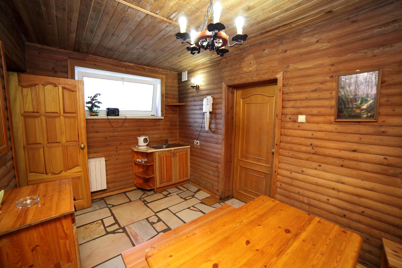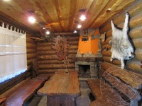 - Вариант обустройства предбанника бревенчатой бани с использованием элементов русского стиля. Наличие текстиля и деревянной посуды.