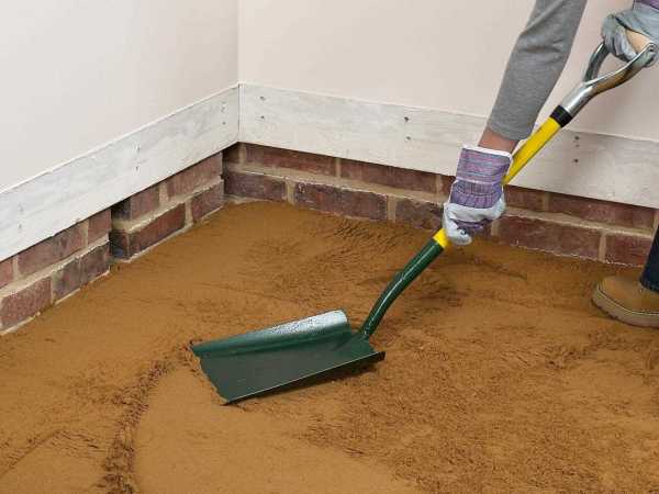 Грунт внутри контура стен фундамента засыпается песком на высоту 10 и более сантиметров. Песок уплотняется с использованием специальной техники и дополнительно просаживается с помощью полива. Для данного вида работы требуется применять речной песок любого размера, обладающий высокой способностью пропускать воду. Остальные виды песка могут содержать примеси глины и не подходят для указанных целей.