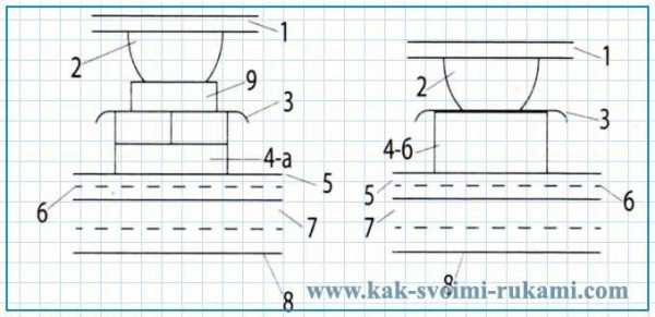 1-половая доска 2-лаги 3-рубероид 4-А – кирпичный столбик 4-Б – бетонный столбик 5 – защитная цементно-песчаная стяжка 6 – гидроизоляция 7 – основание из щебня толщиной 100 мм 8-грунт 9 – деревянная прокладка