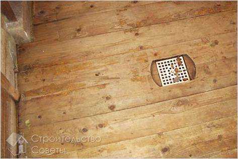 После этого можно приступать к монтажу напольного покрытия. В этом случае предпочтение отдается хвойным сортам дерева, поскольку они изначально содержат смолы и поэтому устойчивы к загниванию и высокой влажности. Половые доски предварительно необходимо обстрогать. Несмотря на влагоотталкивающие качества, на поверхности пола необходимо просверлить отверстия, которые будут способствовать выводу отработанной воды.