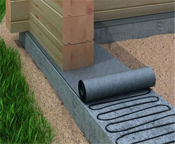 Полотно наклеивается снизу вверх, чтобы получить максимально плотный контакт и предотвратить стекание мастики с поверхности нагреваемого участка фундамента.