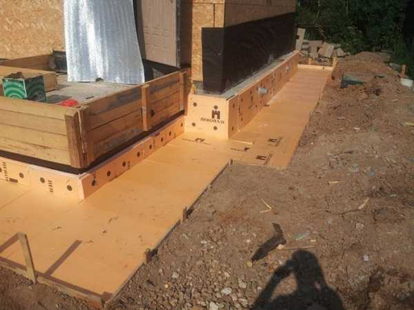 Но это еще не все. ЭППС укладывается на дно траншеи, так делаются утепленные отмостки. Он укладывается на гравийно-песчаную подушку, а сверху заливается бетоном. Ширина отмостков около полутора метров. Только в этом случае утепление фундамента будет законченным.