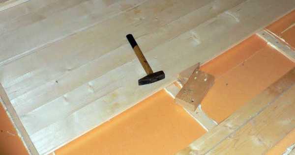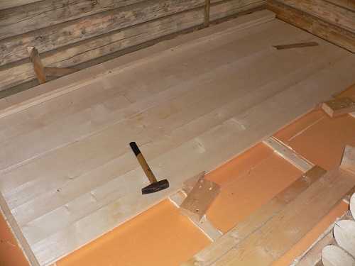 Утеплитель прибивается к поверхности специальными приспособлениями, которые не позволят им «играть» и создавать карманы воздуха, которые в будущем приведут к отслоению слоя пеноплекса. Когда будет полностью покрыта вся поверхность деревянного настила, приступают к установке половых досок, их прибивают непосредственно к деревянным лагам.