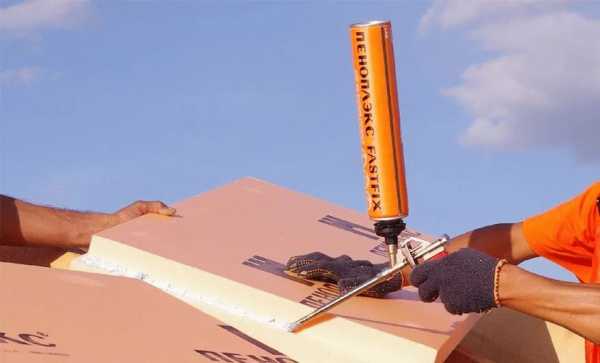 Желательно пеноплекс укладывать на клеящую смесь или монтажную пену. Она наносится по всему периметру листа и в середине. Это нужно делать очень осторожно, пена тяжело отмывается!