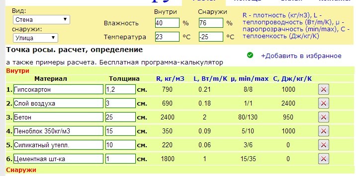 Теплотехнический калькулятор для расчета точки росы
