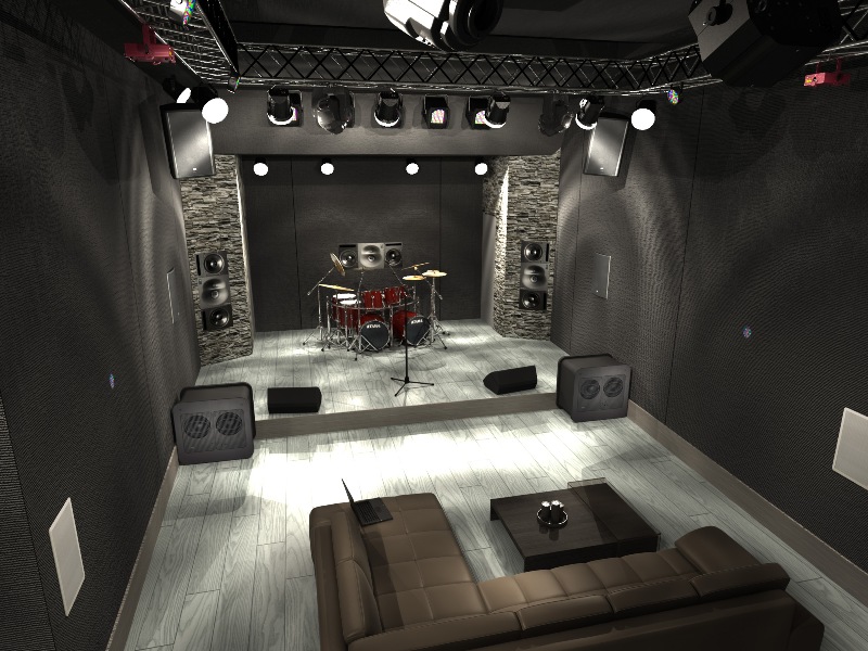 Студия достаточно велика, чтобы вместить его полную установку, а также небольшую установку для записи и, возможно, еще одного или двух дополнительных музыкантов. Дизайн включает в себя плавающий пол, акустические двери с магнитными уплотнениями и систему вентиляции, и он достаточно тихий, чтобы он мог играть часами, не беспокоясь о жалобах соседей.