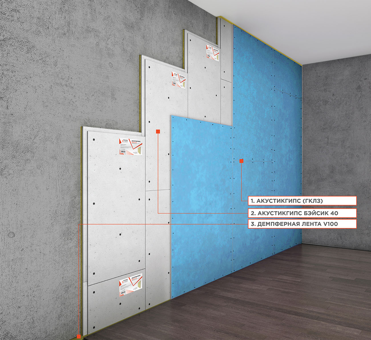 - По-настоящему эффективную звукоизоляцию обеспечивают композитные решения: пустотелые стены с наполнителем. Например, перегородка из одинарных звукоизоляционных гипсовых плит Gyproc АКУ-Лайн или Gyproc Стронг Акустик по 12,5 мм с каждой стороны со 100 мм звукопоглощающим слоем кварцевой ваты ISOVER Тихий Дом при суммарной толщине 125 мм снижает уровень воздушного шума на 54 дБ, а при толщине 150 мм уже на 62 дБ: это звук работающего на средней мощности телевизора или музыкального центра.