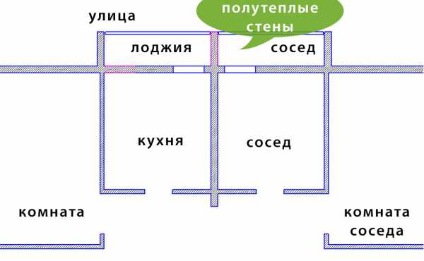 Если у вашей лоджии или балкона есть сосед и он уже утеплился. То многие считают, что утеплять соседнюю с ним часть не обязательно. Это неправильно. По бетону все равно проходит холод. Утеплитель со стороны соседа не нагревает бетон. Такая стенка ничем не отличается от полутёплых.