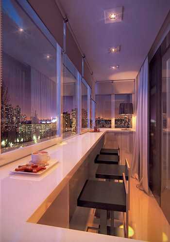 Если вид на город хорош, а выход на лоджию из кухни или столовой, то логично подоконник превратить в барную стойку и устроить роскошный «панорамный» бар