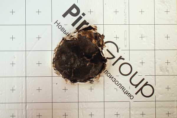5. Снимаем верхний слой и видим абсолютно неповрежденную внутреннюю часть PIR-плиты. То есть, плита не только не поддерживает горение, но и после обгорания представляет собой защитный слой, препятствующий дальнейшему распространению огня.