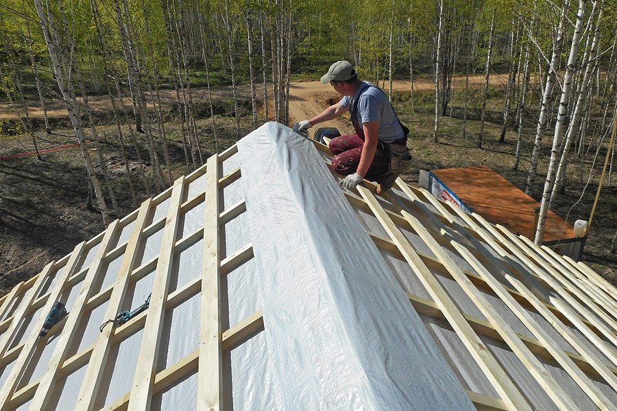 - Укладывается первая полоса пленки, начиная процесс с нижней части. Рулон раскатывается поперек стропил.