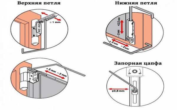 Вертикальное положение створки регулируется при помощи болта на нижней петле. Делается это так: