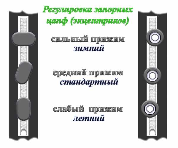 На торцевой части створки со стороны ручки есть система (регуляторов) эксцентриков. Она регулирует степень прилегания створки. Вид систем зависит от фирмы установленного окна, принцип в работе всегда аналогичен.
