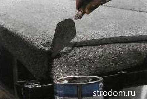 ![]() | Обильно нанесите битумный клей вдоль верхнего края первой полосы рубероида. |